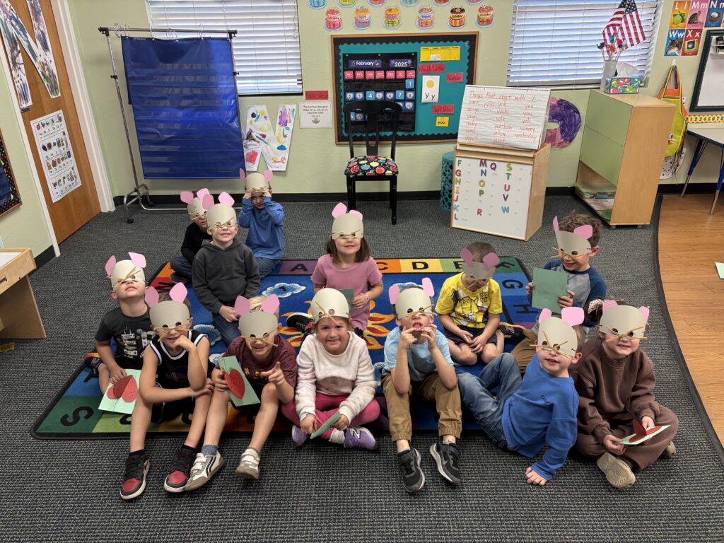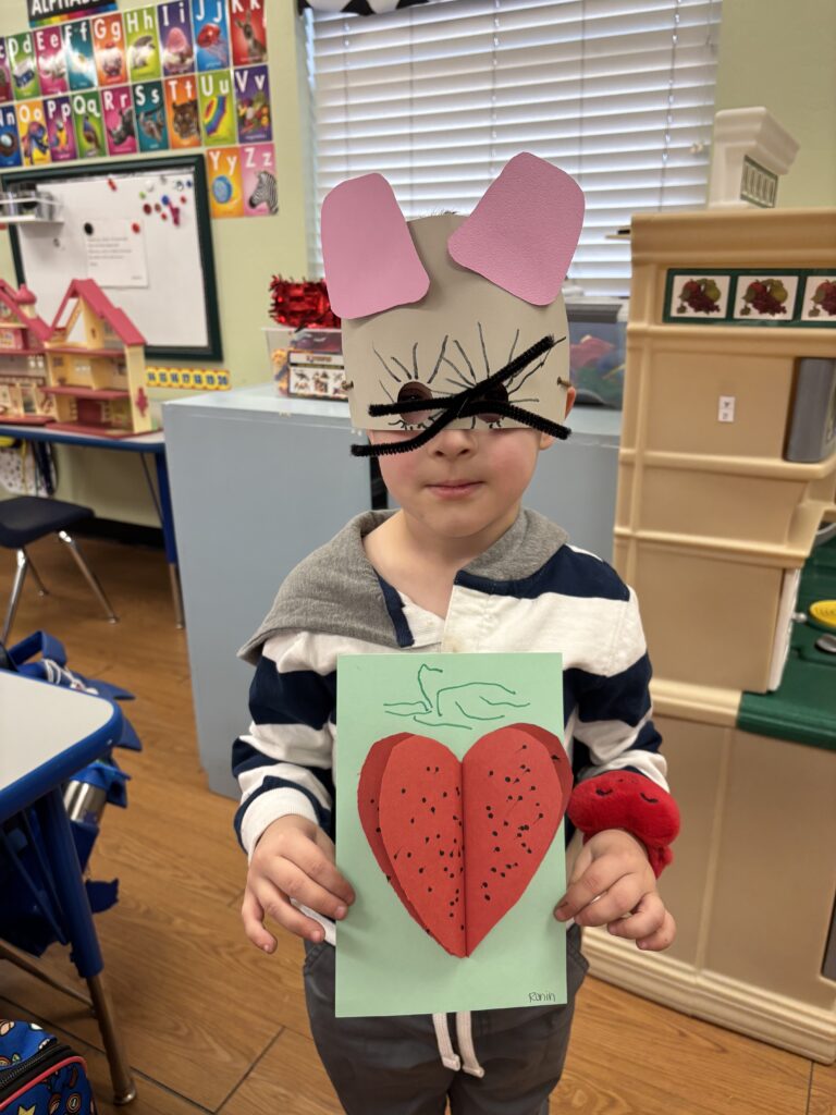 Lunch bunch this week we read “The Little Mouse, The Red, Ripe, Juicy Strawberry and the Big Hungry Bear” by Don and Aubrey Wood. We made a giant strawberry out of heats and a fun mouse mask.